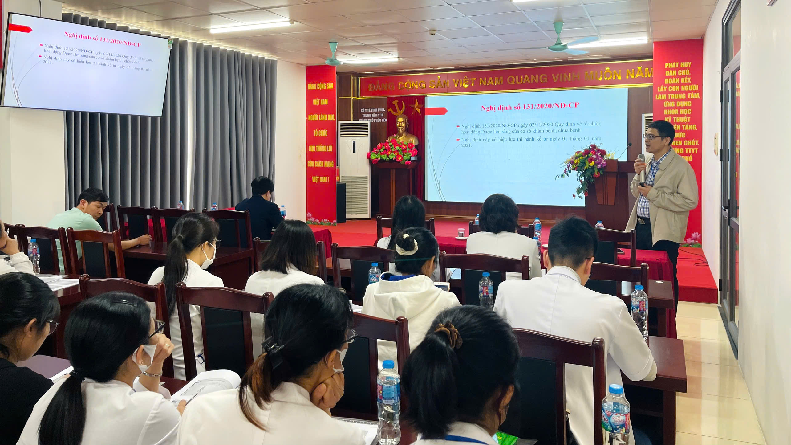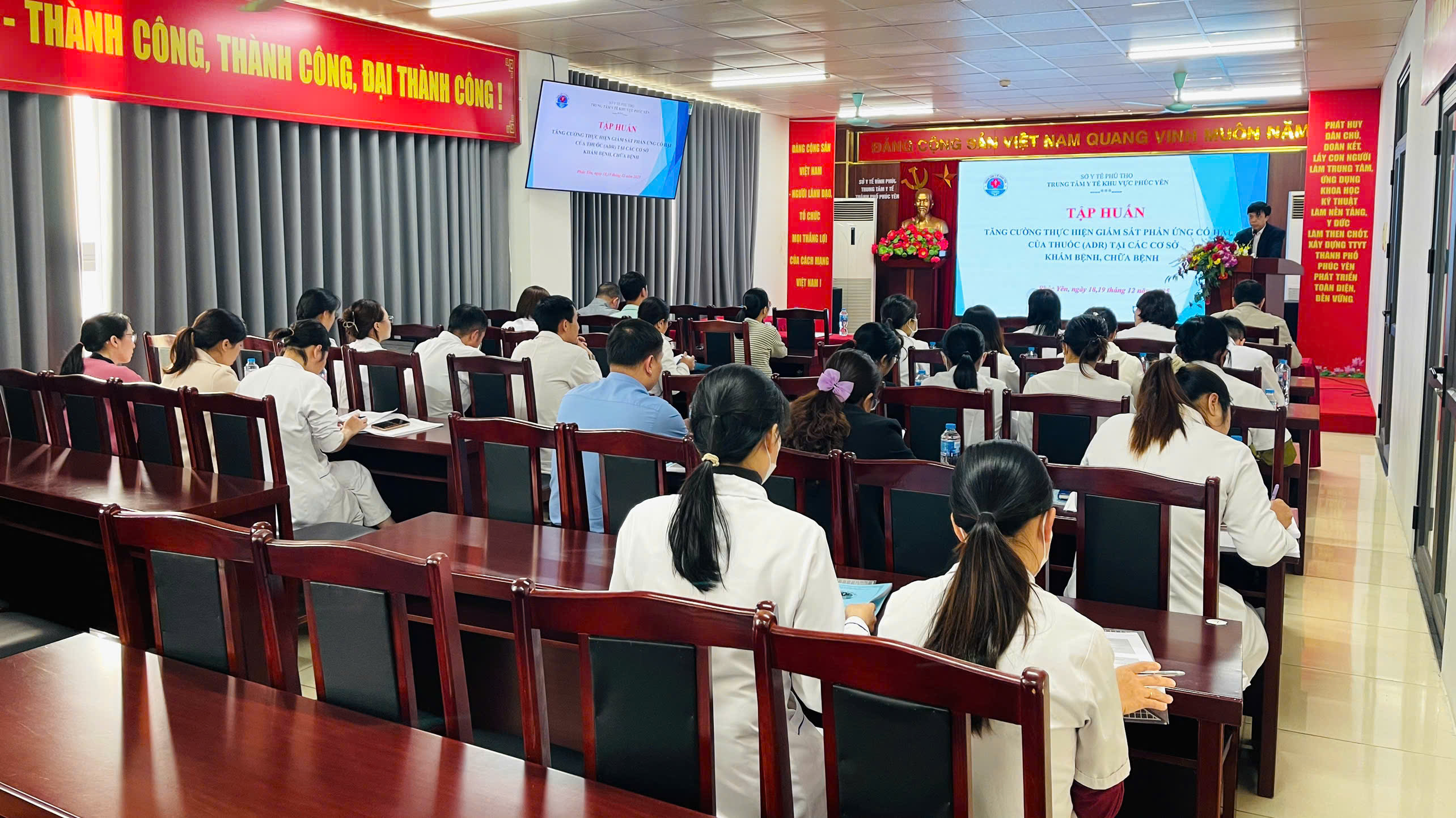 Lớp tập huấn được tổ chức với sự tham dự của gần 50 học viên là cán bộ phụ trách lĩnh vực y tế UBND phường Phúc Yên, Xuân Hòa; cán bộ phụ trách công tác Dược tại các Trạm Y tế phường cùng cán bộ, viên chức các khoa, phòng thuộc Trung tâm.